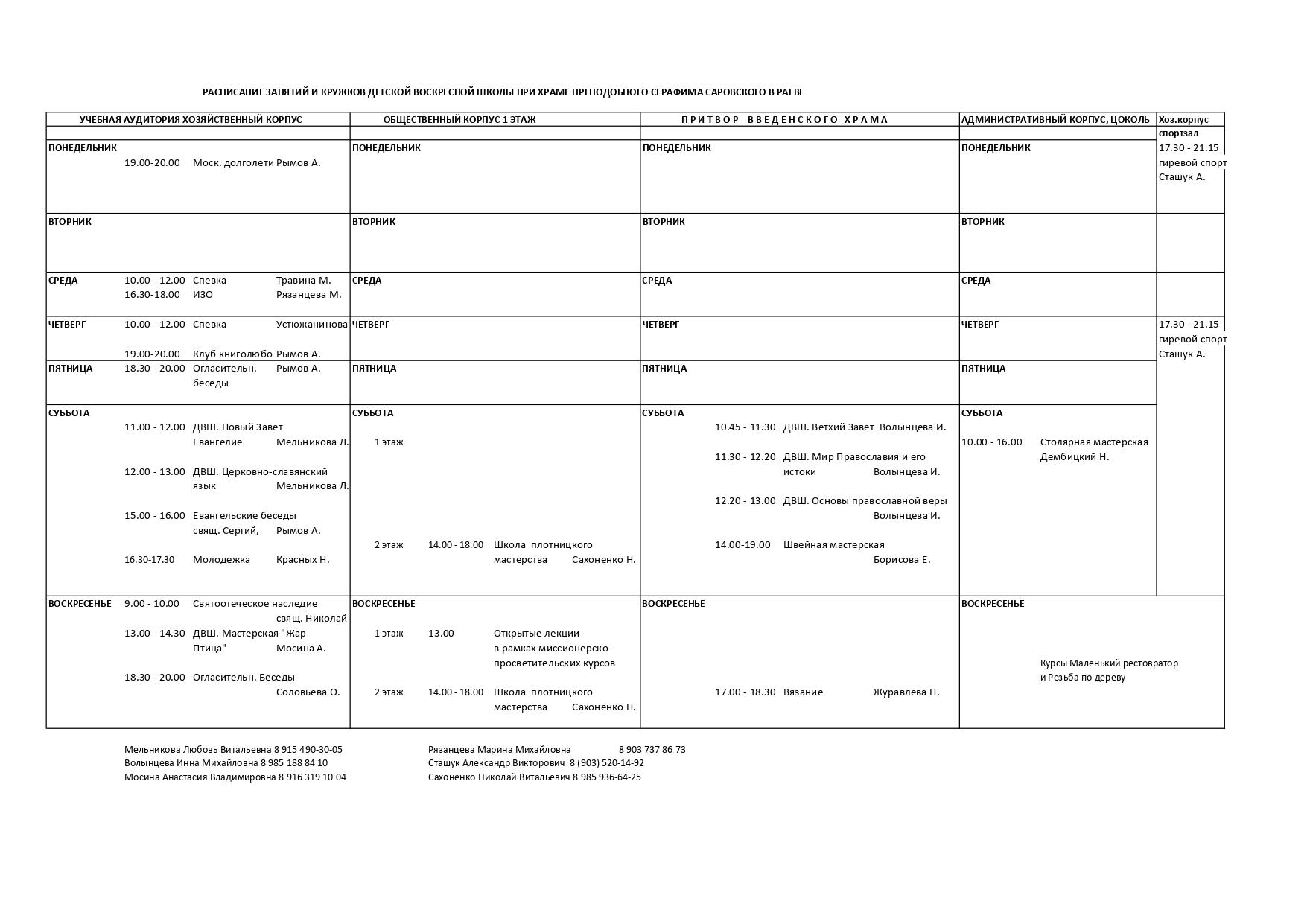 Расписание занятий и кружков воскресной школы.